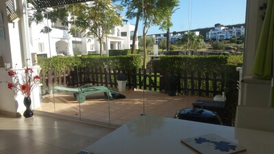 This very nice pool front ground floor corner apartment on Calle Indico really has it all, it has a spacious indoor terrace with glass curtains and also a private outside terraced garden ideal for sunbathing leading straight to the swimming pool. The living room is open plan and tastefully furnished with air conditioning. There are two double bedrooms and a well-equipped kitchen including oven, hob, fridge freezer, washing machine. There is a good-sized bathroom with bath, shower, WC and vanity with arched window. This apartment comes fully furnished and includes underground parking.